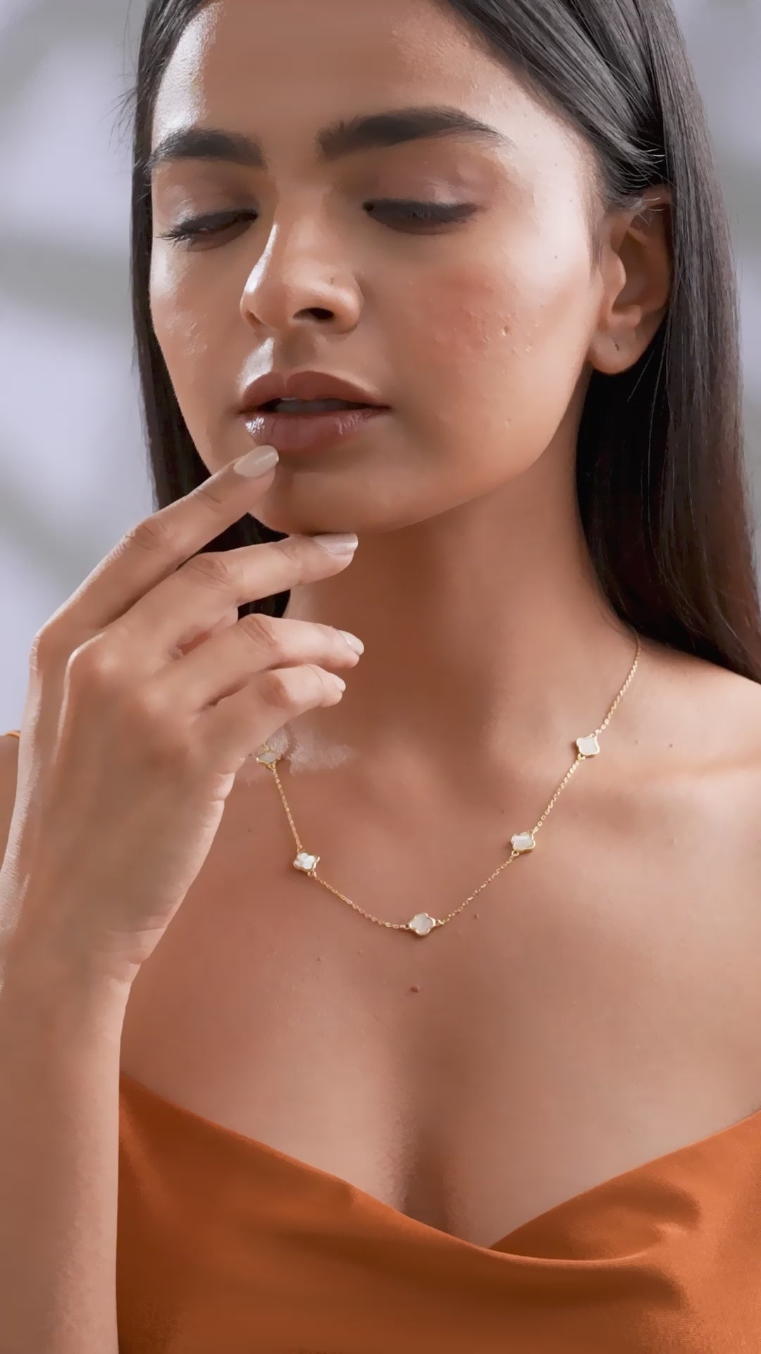 A single, delicate chain punctuated with five clover-shaped inlays, each framed in gold and glowing with a pearlescent sheen—timeless, graceful, and designed to add a hint of charm to your everyday elegance.