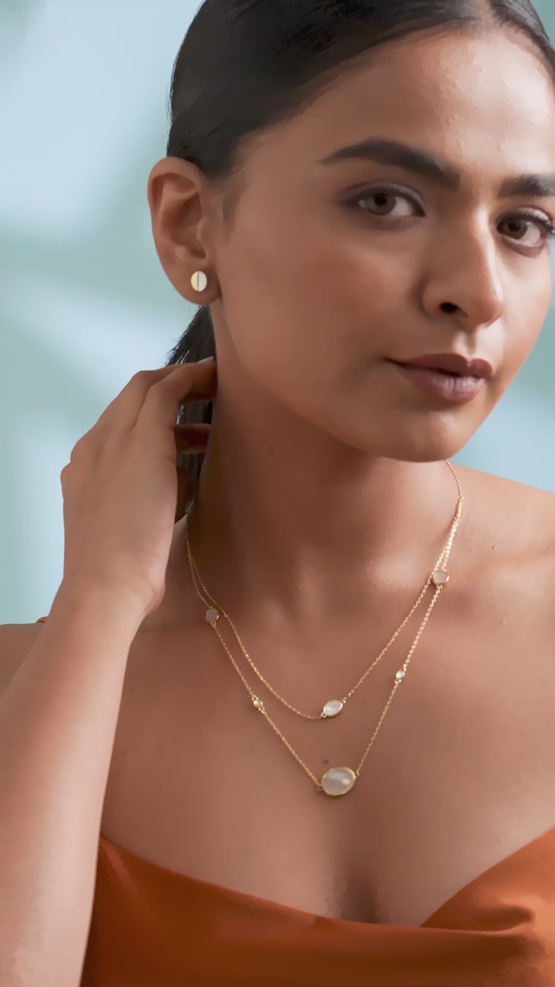 A blend of modern elegance and timeless charm, this necklace set is a true statement of sophistication. The layered necklace is adorned with delicate oval charms, each shimmering with the luminous beauty of mother-of-pearl, adding a touch of refined brilliance. Paired with matching stud earrings that echo the same graceful oval design, this set embodies effortless elegance, making it a versatile and captivating addition to any collection.