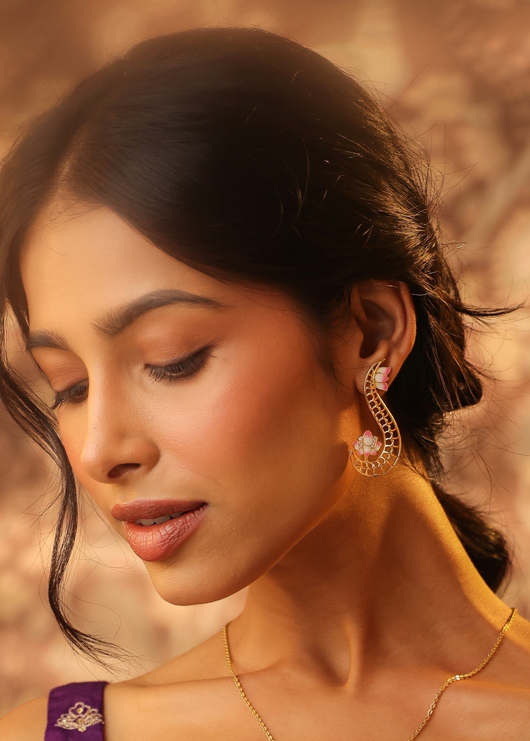 The Moissanite Exquisite Mangalayam 925 Sterling Silver Earrings For Women earring tells a story of peace and courage. The gentle pink lotus, India's timeless symbol of purity, gracefully unfolds within a golden hoop, sheltering a dazzling pearl that resembles morning dew. Moissanite details around the curve create a pious feel. A poem that reads like poetry: delicate, meaningful, and deeply steeped in culture.