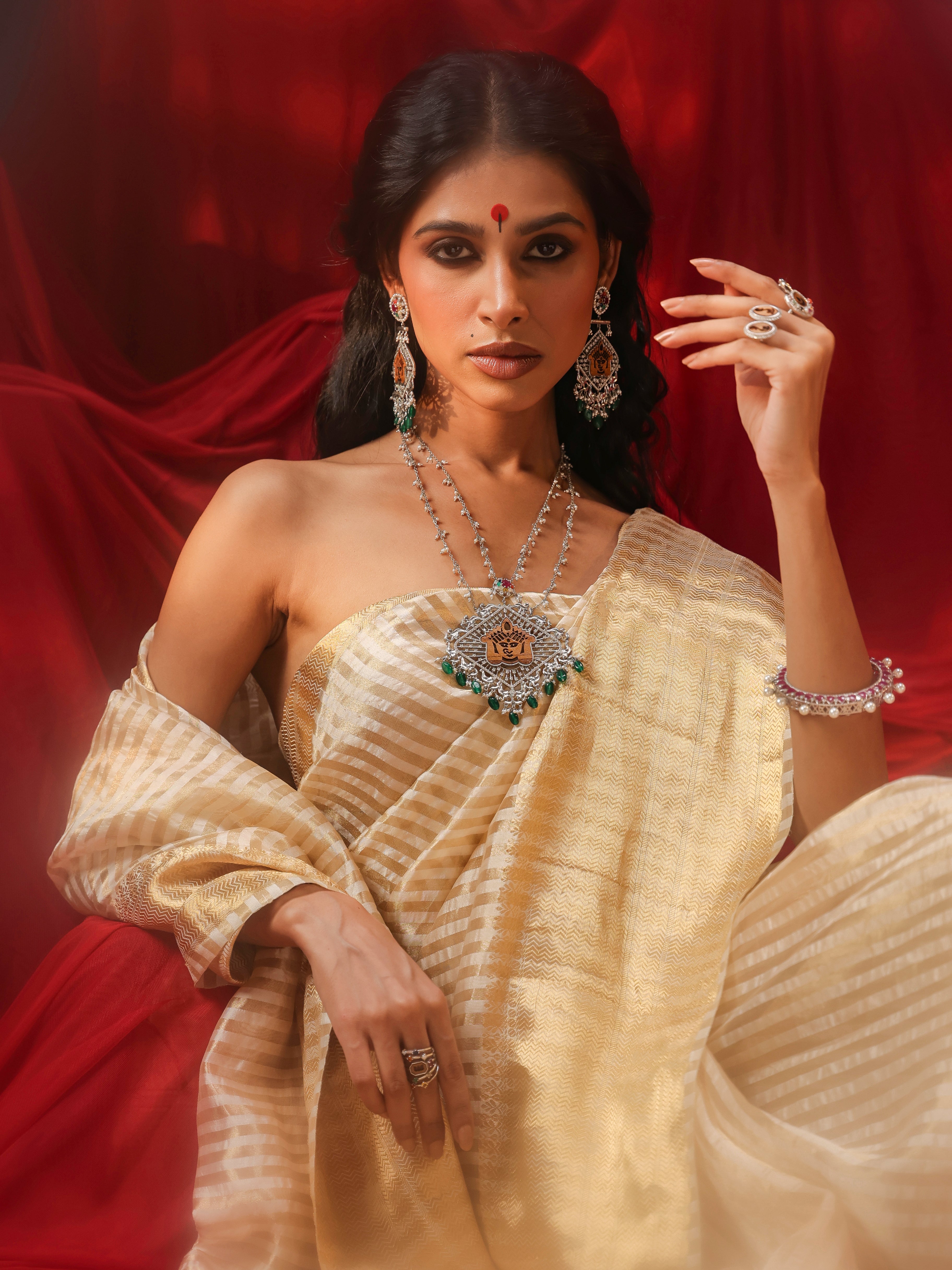 The Green Onyx Ma Durga Necklace Set is a stunning tribute to divine grace and artistry. Layered with delicate pearls, the centerpiece showcases a meticulously carved wooden motif of Ma Durga, framed in intricate silver filigree. Accentuated by a halo of shimmering moissanites and adorned with celestial navratna gems, it blends spiritual symbolism with contemporary elegance. The matching earrings echo the filigree patterns, completing this exquisite fusion of tradition and modernity.