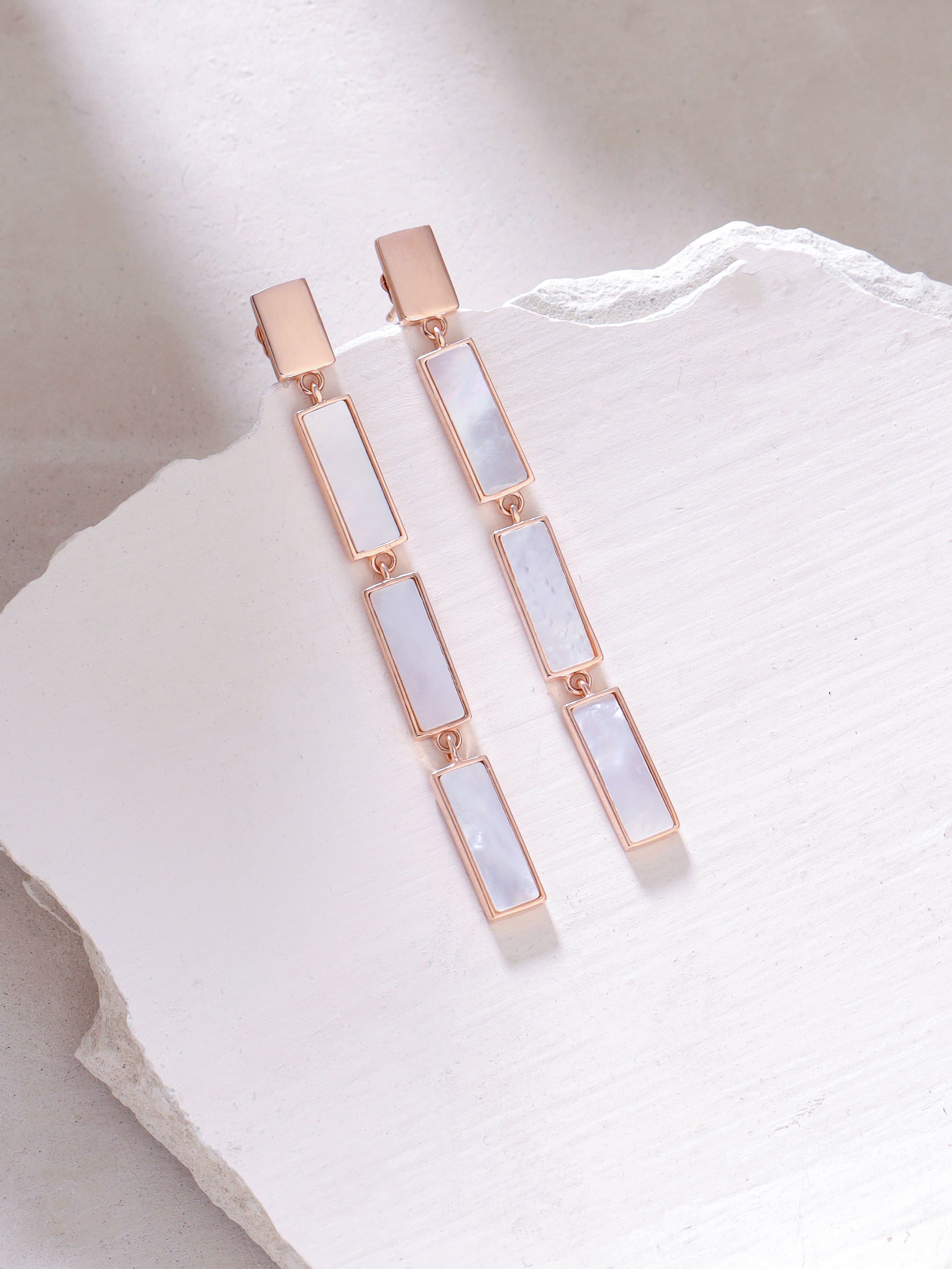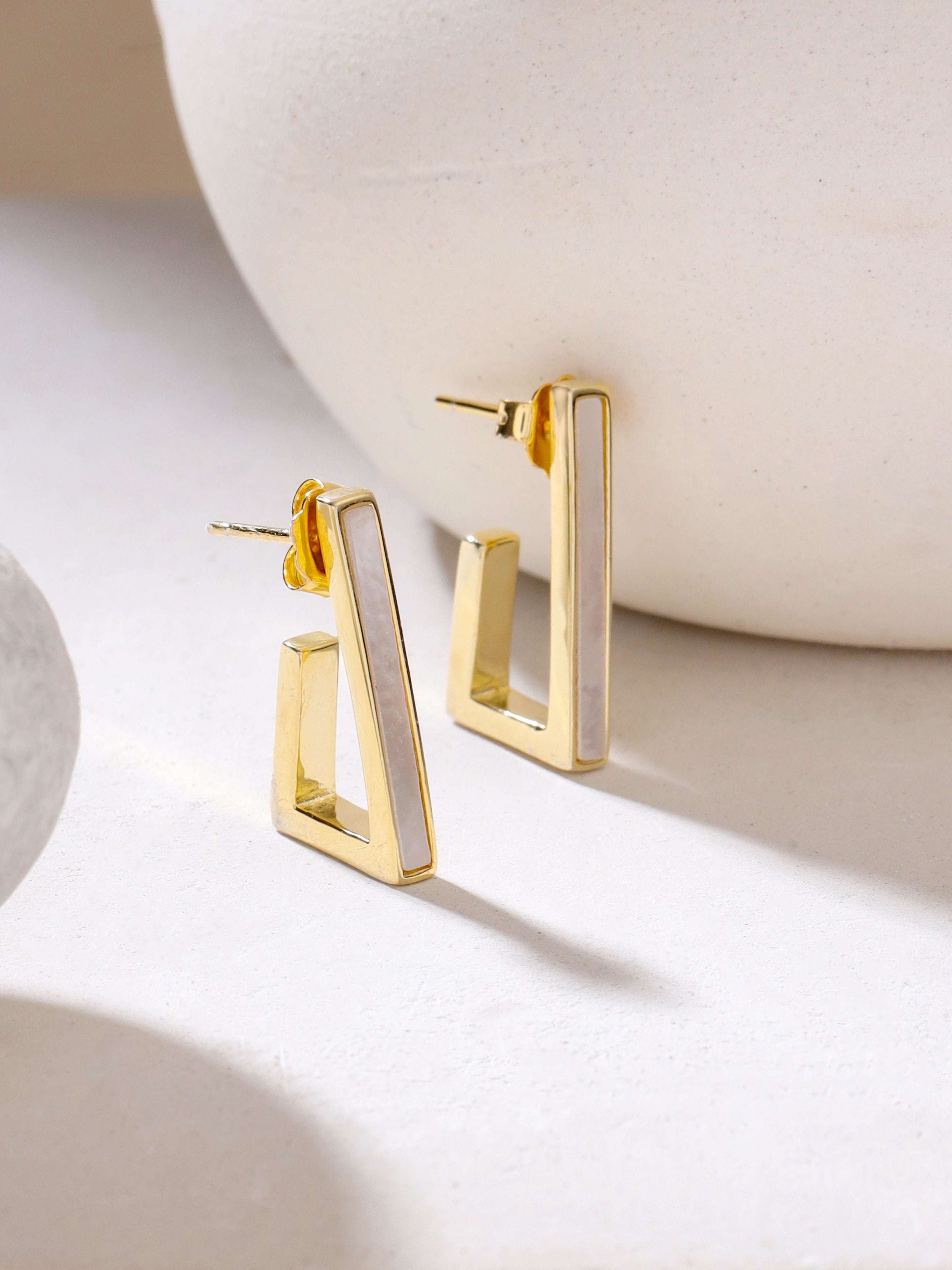 The Geometric Mother of Pearl Earrings Syra Collection Silver Rhodium marry modern sophistication with a timeless grace befitting the most discerning tastes. Their sleek geometric design, adorned with luminous mother-of-pearl and a polished rhodium finish, whispers of understated refinement. Also available in 24k Gold and Rose Gold Plating, these elegant adornments promise to elevate any ensemble with effortless charm to make you entirely alluring.