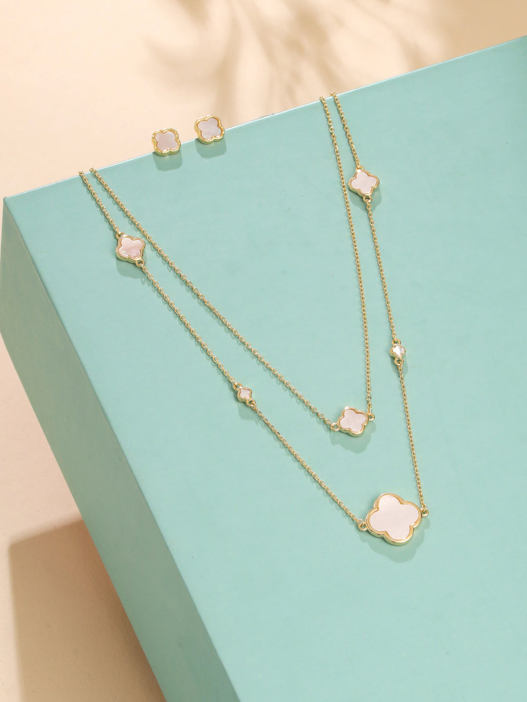 A symbol of luck and timeless grace, the Clover Mother of Pearl Necklace Set embodies effortless elegance. The layered necklace is adorned with delicate clover-shaped charms, each glowing with the soft iridescence of mother-of-pearl—a reminder of fortune and beauty intertwined. Paired with matching stud earrings, this set radiates understated charm and refined sophistication, perfect for those who believe in a little everyday magic.