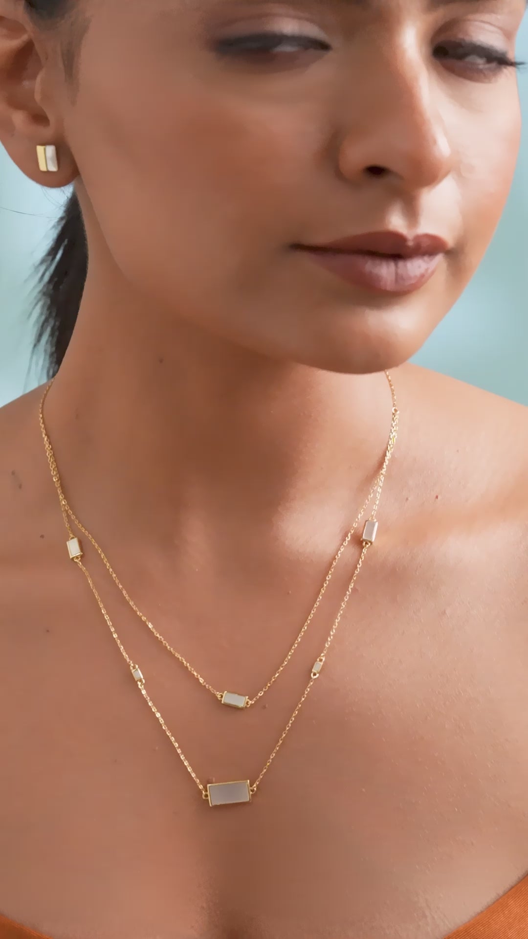 Modern elegance meets timeless charm in this layered necklace set. Featuring sleek rectangular mother-of-pearl charms framed in class, the delicate chains create a refined silhouette with a contemporary edge. The matching stud earrings echo the minimalist design, making this set a perfect blend of sophistication and everyday wearability.