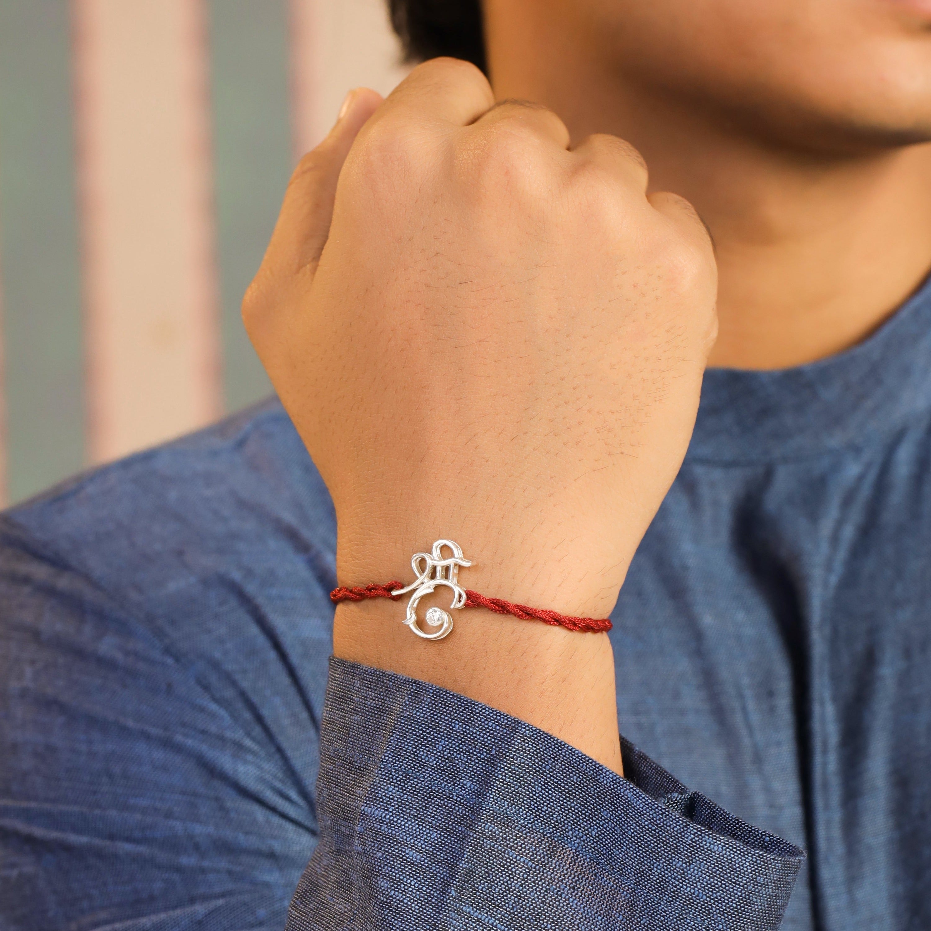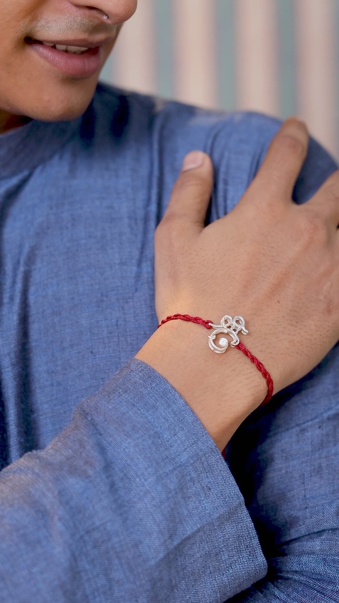 Embrace the divine bond of sibling love with our enchanting Sacred Blessings Rakhi. This 925 sterling silver Rakhi showcases a mesmerizing Shri Ganesh Ji design adorned with a single stone set, symbolizing auspiciousness and protection. Experience the essence of the Rakhi festival as this exquisite piece becomes a sacred thread, weaving together the eternal bond of love, blessings, and togetherness between a brother and sister.
