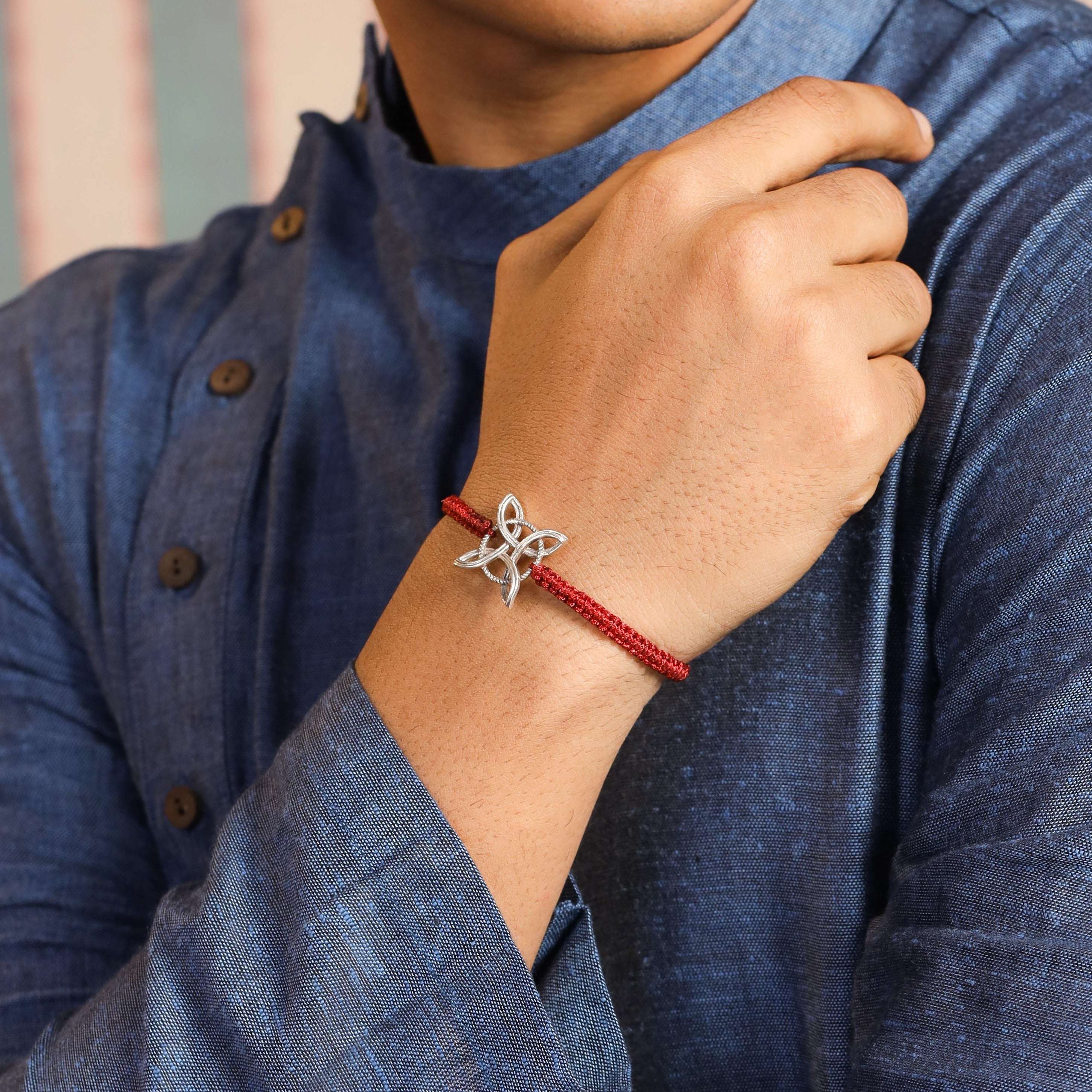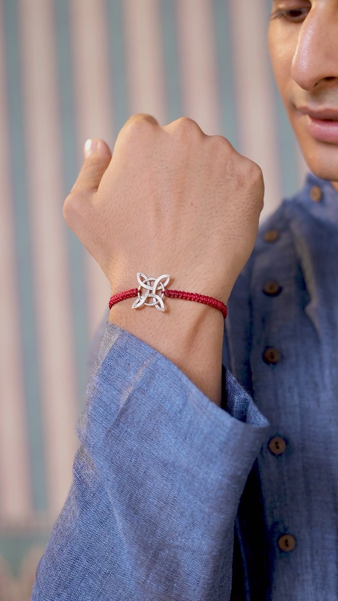 The Sacred Celtic Knot Rakhi features intricate Celtic knots, symbolizing eternal love and good luck. Crafted with pure 925 sterling silver, The delicate silver bracelet showcases the timeless beauty of the Celtic design. The Rakhi represents the goodness and blessings of the festival, strengthening the bond between brothers and sisters.