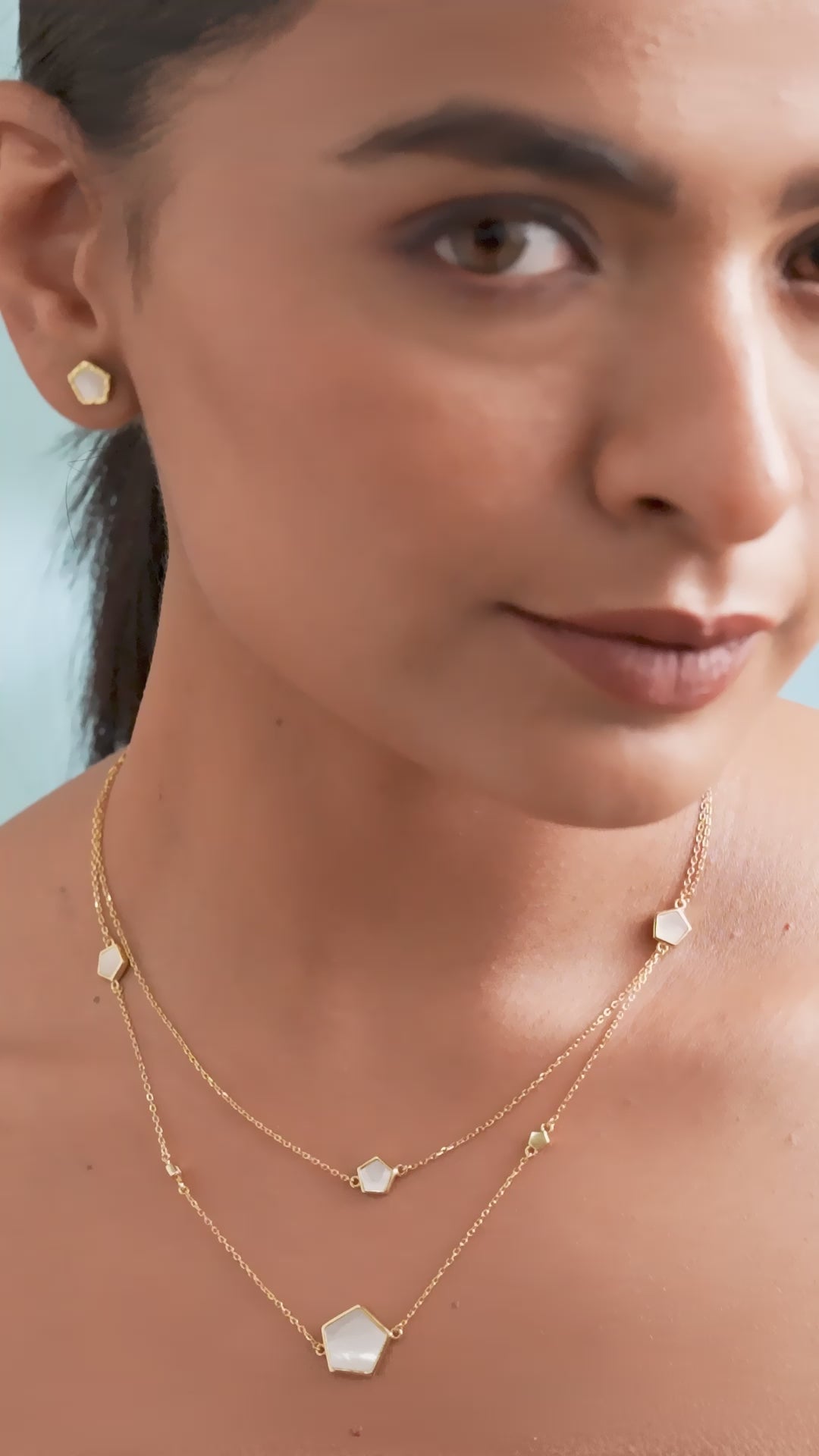 A symphony of geometric grace, this necklace set brings a refined edge to timeless elegance. Delicately linked, the layered necklace features pentagon-shaped charms, each glowing with the soft iridescence of mother-of-pearl. Paired with matching stud earrings, this set is a seamless blend of structure and sophistication—perfect for those who appreciate modern design with a touch of ethereal beauty.