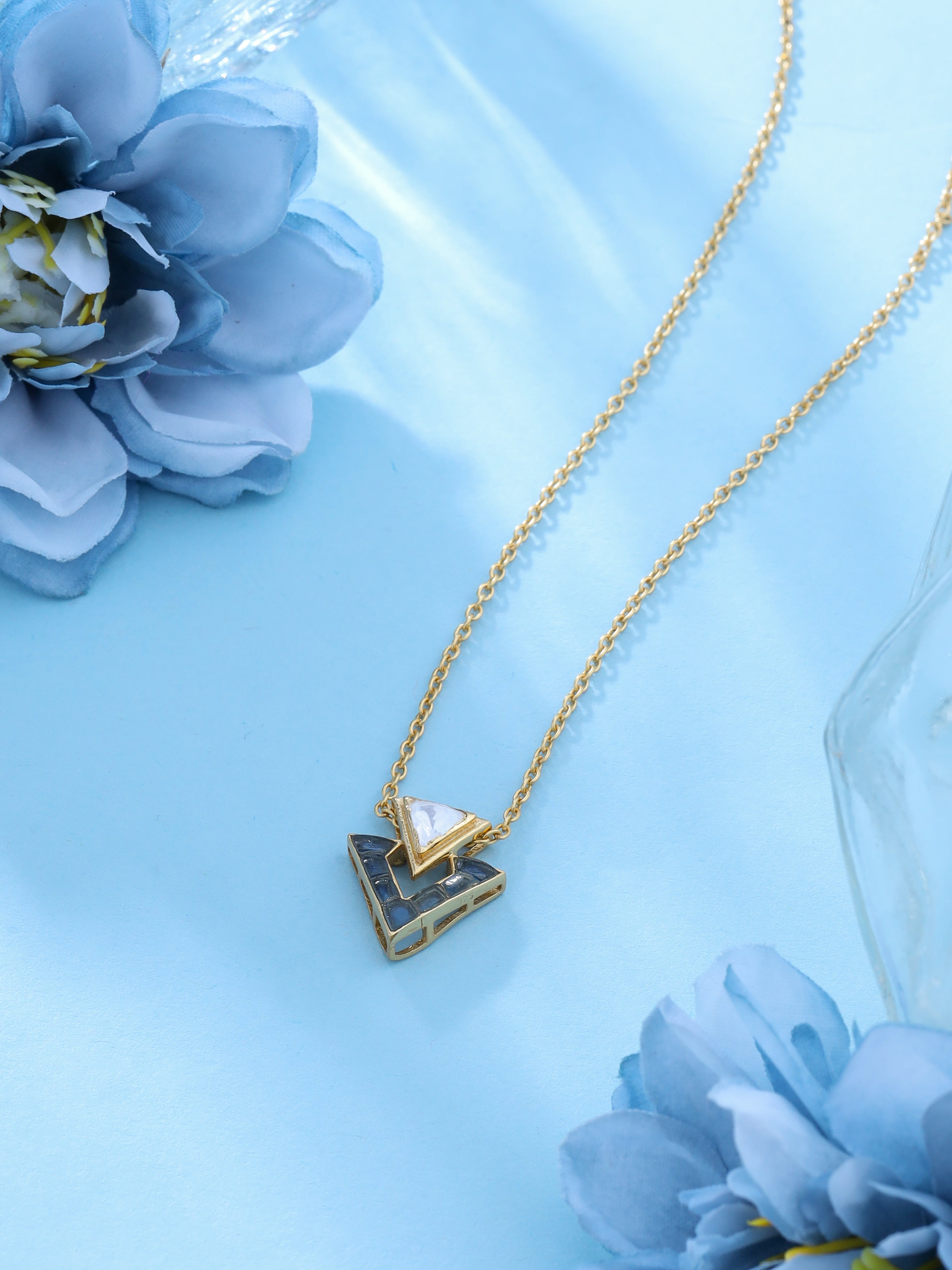 Step into a world of geometric elegance with this meticulously crafted pendant. A stunning display of modern design, it pairs the timeless allure of 24K gold-plated silver with the contemporary charm of geometric shapes. Set with luminous blue talfe and sparkling moissanite polki, this piece is a testament to refined taste and innovation.