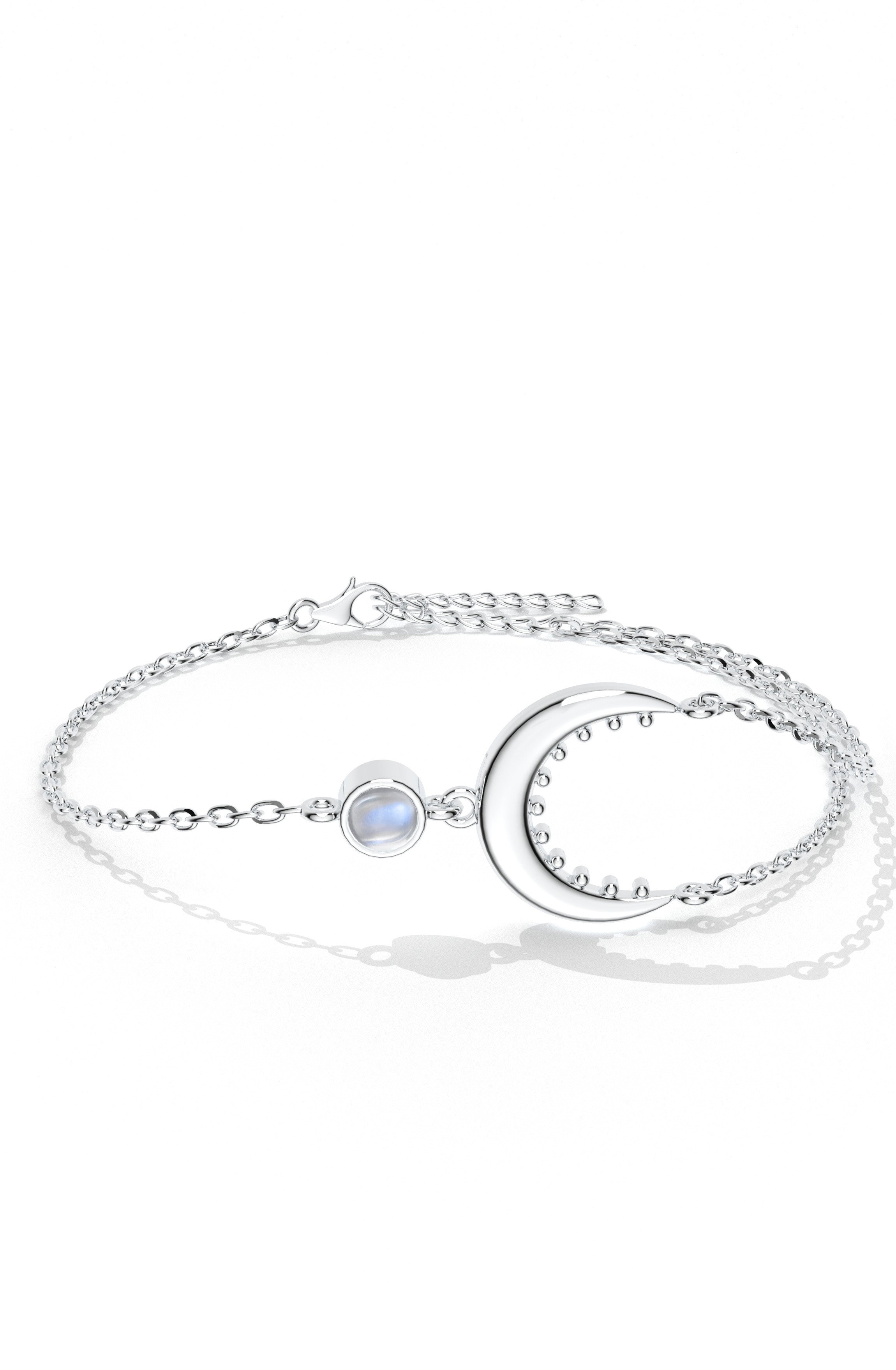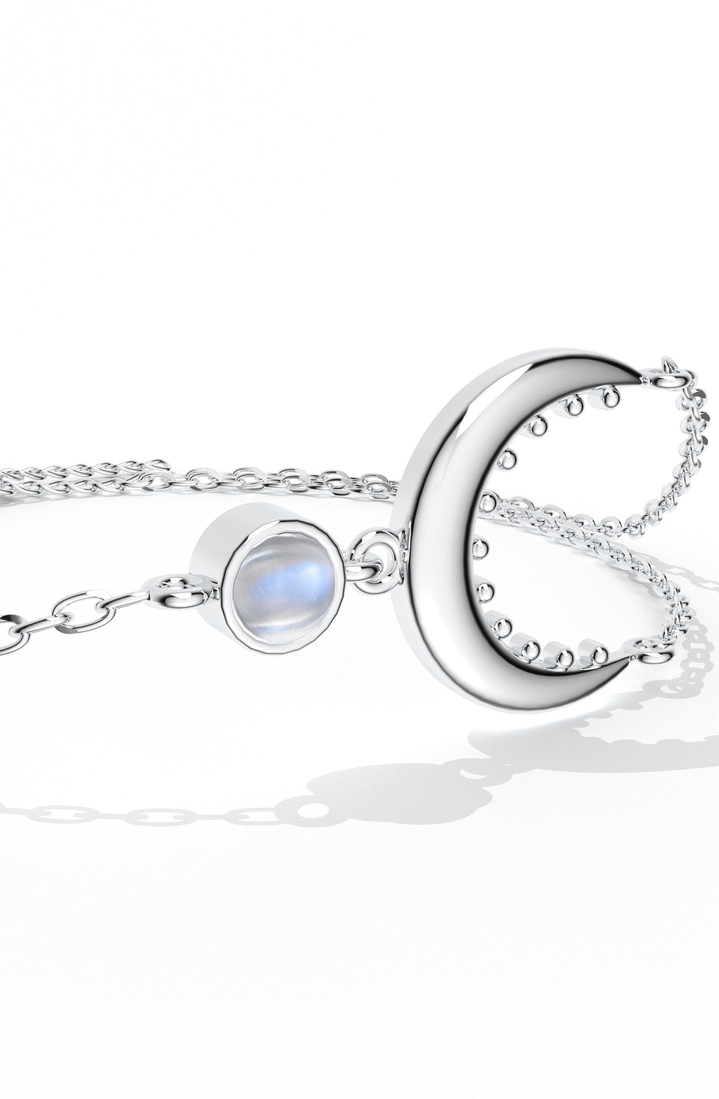 A delicate tribute to the quiet glow of the night sky, this silver-toned bracelet captures the magic of moonlit wonder. At its heart, a smooth crescent moon cradles a luminous moonstone, aligned in perfect harmony. A symbol of serenity and celestial guidance, this piece whispers of dreams, intuition, and the ever-present light that leads the way.