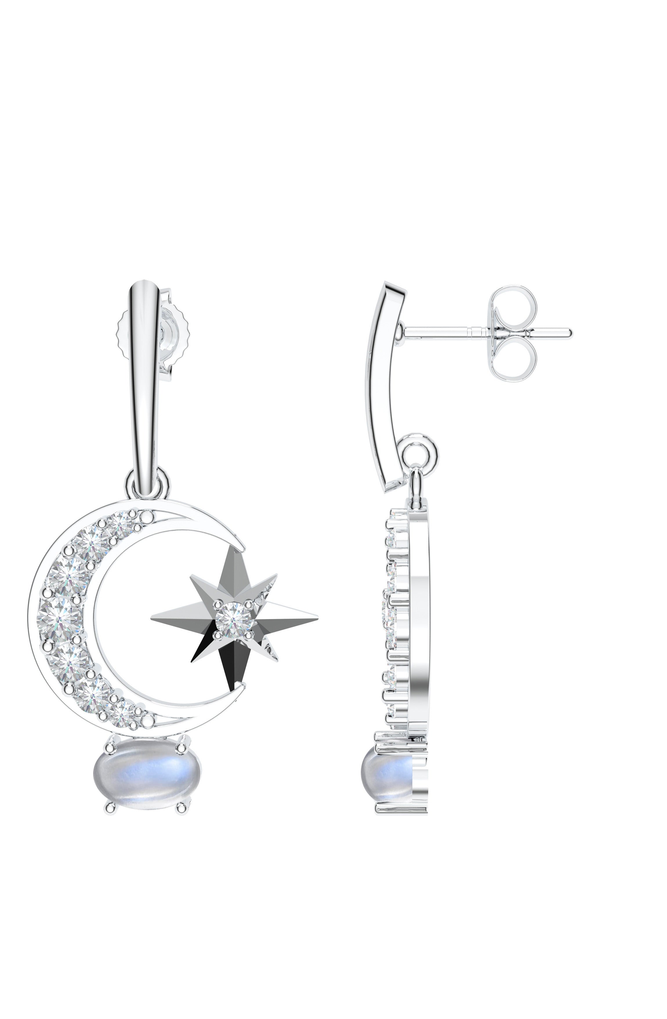 Our designers wanted to capture the beauty and elegance of a solar eclipse—an awe-inspiring moment when the moon embraces the sun in a celestial waltz. This exquisite earring brings that vision to life, with a moissanite-studded crescent moon gracefully encircling a radiant star. Below, a luminous moonstone dangles like the soft halo of light that lingers at the eclipse’s edge, a reminder that even in shadow, brilliance endures.