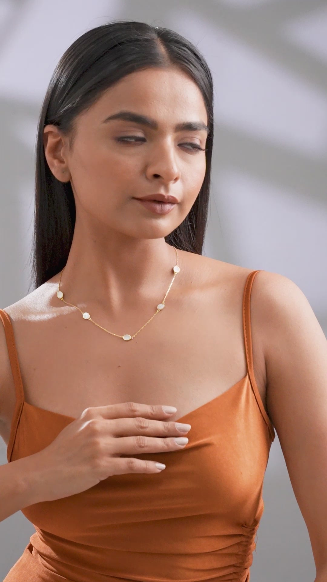 A celebration of simplicity, this necklace exudes effortless sophistication. The mother-of-pearl inlays catch the light in a dance of soft iridescence, making it a versatile staple for any look.
