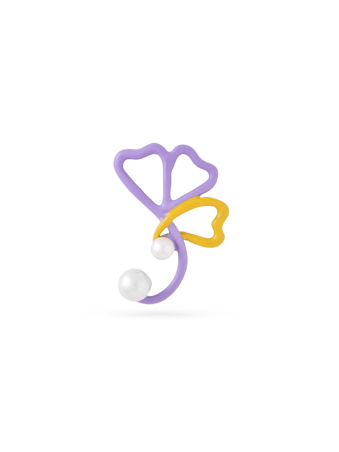 This brooch draws inspiration from the organic shape of a hibiscus in bloom, featuring intertwining enamel petals—two in a fresh spring purple and one in a rich mustard yellow. A luminous pearl nestles at the heart where the petals meet, while a second pearl gracefully drops from the stem-like extension, lending the piece a delicate sense of movement and dimension.