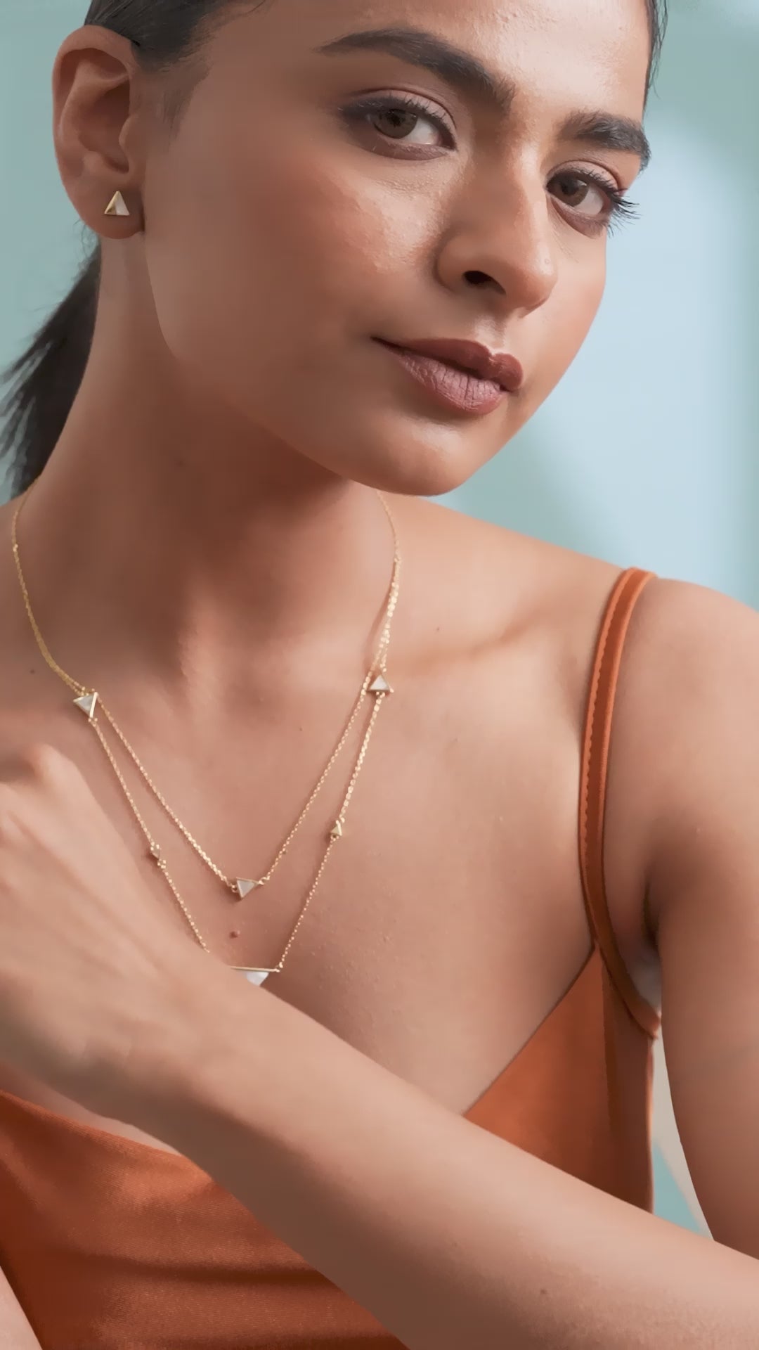 Sleek, modern, and effortlessly striking—this layered necklace set brings geometric elegance to the forefront. Delicate chains are adorned with triangular mother-of-pearl charms, their clean lines adding a refined edge to the design. The matching stud earrings echo this minimal yet bold aesthetic, making this set a go-to for those who appreciate understated sophistication with a contemporary twist.